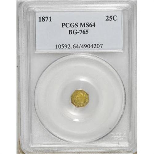 <B>1871 25C Liberty Octagonal 25 Cents, BG-765, R.3, MS64 PCGS.</B></I> . PCGS Population (25/4). NGC Census: (1/1). (#10592)<BR><BR><b>Shipping:</b> Coins & Currency (<a target="_blank" href="http://www.heritageauctions.com/common/shipping.php">view shipping information</a>)