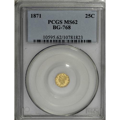 <B>1871 25C Liberty Octagonal 25 Cents, BG-768, R.4, MS62 PCGS.</B></I> A modestly reflective and well struck yellow-gold example of this very scarce variety. Minor haze is noted in the fields. Population: 19 in 62, 15 finer (1/07).<BR><BR><b>Shipping:</b> Coins & Currency (<a target="_blank" href="http://www.heritageauctions.com/common/shipping.php">view shipping information</a>)