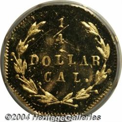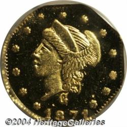 <B>1871<25C> Liberty Octagonal 25 Cents, BG-768, R.4, MS64 DPL NGC.</B></I> Struck by the California Jewelry Co., successors to Gray & Co. Small, high G on the obverse. The first 1 of the date is high; the next three digits touch the denticles. The reverse shows a low AR in DOLLAR and a slightly raised dot at the end of the right stem. Gold and watery-green toning alternate over the prooflike surfaces of this deeply mirrored near-Gem. Unquestionably one of the finest surviving examples of this variety. <BR><BR><B>Important notice:</B> Heritage usually auctions material at the rate of 200-250 lots per hour. On some occasions eBay Live bid software or the Internet may not be able to keep up with the pace of the auction. We recommend placing a realistic absentee bid now as insurance to avoid disappointment. Occasionally the auctioneer may eliminate or reject an eBay Live bid, and the auctioneer may also reopen a lot after the close of the eBay live bidding (usually because we missed an audience bid), and may reject your bid even if it shows you as the winning bidder. By bidding via eBay Live, you agree that Heritage may award the lot to another bidder at its sole discretion under the circumstances described above or any other reasonable circumstances. Since eBay bids are not shown to us until we open the lot on the floor, we treat those bids just like floor bids. In most cases the floor responds before the eBay bid is presented to us, due to Internet lag time, so for consistency we have made it a policy that floor bids are always considered first over tie eBay live bids. Also please note that all Heritage lots purchased through eBay Live carry a 20% Buyer's Premium. Please make sure you read the Terms and Conditions before you bid. </span></font></tr></table></td></tr></table>