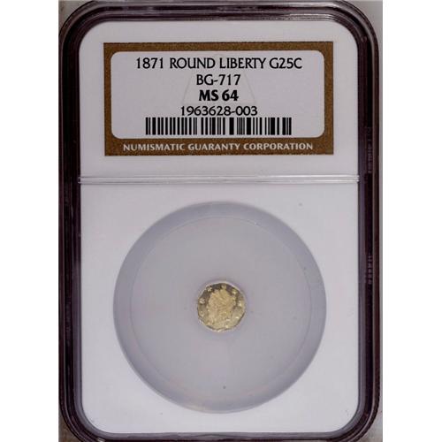 <B>1871<25C> Liberty Octagonal 25 Cents, BG-717, R.3, MS64 NGC.</B></I> The label on the NGC holder mistakenly says that this is a Round variety. The bright yellow-gold surfaces are well preserved, and the strike is penetrating.