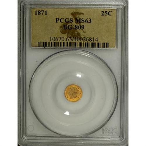<B>1871 25C Liberty Round 25 Cents, BG-809, Low R.4, MS63 PCGS.</B></I> PCGS Population (19/51). NGC Census: (4/6). (#10670)<BR><BR><b>Shipping:</b> Coins & Currency (<a target="_blank" href="http://www.heritageauctions.com/common/shipping.php">view shipping information</a>)