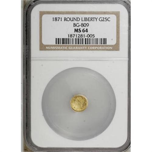 <B>1871 25C Liberty Round 25 Cents, BG-809, Low R.4, MS64 NGC.</B></I> . NGC Census: (4/2). PCGS Population (28/23). (#10670)<BR><BR><b>Shipping:</b> Coins & Currency (<a target="_blank" href="http://www.heritageauctions.com/common/shipping.php">view shipping information</a>)