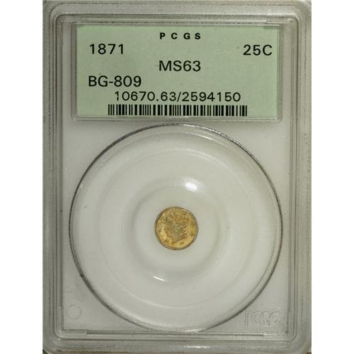 <B>1871 25C Liberty Round 25 Cents, BG-809, Low R.4, MS63 PCGS.</B></I> PCGS Population (19/51). NGC Census: (2/5). (#10670)<BR><BR><b>Shipping:</b> Coins & Currency (<a target="_blank" href="http://www.heritageauctions.com/common/shipping.php">view shipping information</a>)