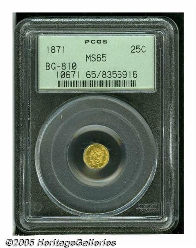 <B>1871<25C> Liberty Round 25 Cents, BG-810, Low R.7, MS65 PCGS.</B></I> An elusive Frontier & Co. variety, identified by a high date and 2 pairs of berries on each side of the wreath. Quite flashy, and bordering on prooflike status on each side. Certified in a green label holder.