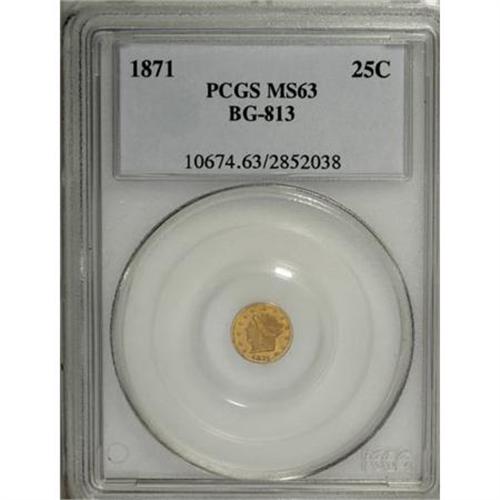 <B>1871 25C Liberty Round 25 Cents, BG-813, R.3, MS63 PCGS.</B></I> PCGS Population (39/46). NGC Census: (8/10). (#10674)<BR><BR><b>Shipping:</b> Coins & Currency (<a target="_blank" href="http://www.heritageauctions.com/common/shipping.php">view shipping information</a>)