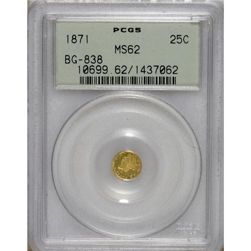 <B>1871 25C Liberty Round 25 Cents, BG-838, R.2, MS62 PCGS.</B></I> PCGS Population (126/76). NGC Census: (19/13). (#10699)<BR><BR><b>Shipping:</b> Coins & Currency (<a target="_blank" href="http://www.heritageauctions.com/common/shipping.php">view shipping information</a>)