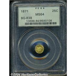 <B>1871<25C> Liberty Round 25 Cents, BG-838, R.2, MS64 PCGS.</B></I> A lovely canary-gold near-Gem that has nearly undisturbed surfaces. Encapsulated in a green label PCGS holder. The G initial is double punched. Population: 21 in 64, 0 finer (3/04). <BR><BR><B>Important notice:</B> Heritage usually auctions material at the rate of 200-250 lots per hour. On some occasions eBay Live bid software or the Internet may not be able to keep up with the pace of the auction. We recommend placing a realistic absentee bid now as insurance to avoid disappointment. Occasionally the auctioneer may eliminate or reject an eBay Live bid, and the auctioneer may also reopen a lot after the close of the eBay live bidding (usually because we missed an audience bid), and may reject your bid even if it shows you as the winning bidder. By bidding via eBay Live, you agree that Heritage may award the lot to another bidder at its sole discretion under the circumstances described above or any other reasonable circumstances. Since eBay bids are not shown to us until we open the lot on the floor, we treat those bids just like floor bids. In most cases the floor responds before the eBay bid is presented to us, due to Internet lag time, so for consistency we have made it a policy that floor bids are always considered first over tie eBay live bids. Also please note that all Heritage lots purchased through eBay Live carry a 20% Buyer's Premium. Please make sure you read the Terms and Conditions before you bid.