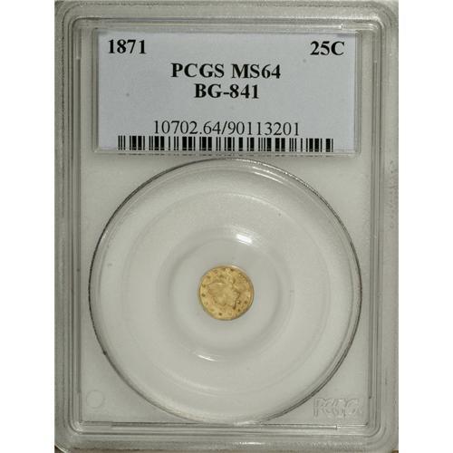 <B>1871 25C Liberty Round 25 Cents, BG-841, R.4, MS64 PCGS.</B></I> PCGS Population (9/2). NGC Census: (2/0). (#10702)<BR><BR><b>Shipping:</b> Coins & Currency (<a target="_blank" href="http://www.heritageauctions.com/common/shipping.php">view shipping information</a>)