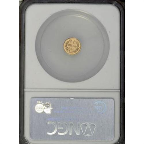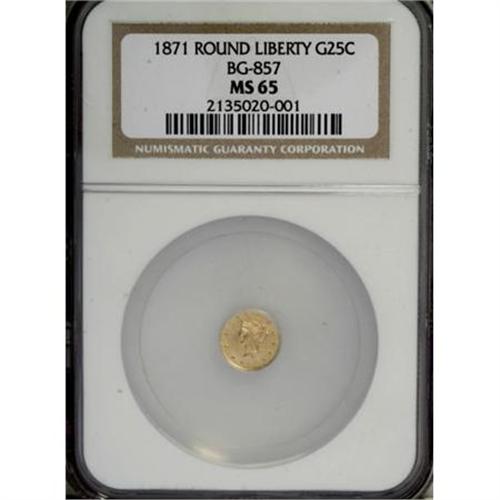 <B>1871 25C Liberty Round 25 Cents, BG-857, High R.4, MS65 NGC.</B></I> Strong, swirling luster enlivens well-preserved yellow-gold surfaces with crisply detailed devices. This attractive example is the finer of just two examples certified by NGC (1/08).<BR><BR><b>Shipping:</b> Coins & Currency (<a target="_blank" href="http://www.heritageauctions.com/common/shipping.php">view shipping information</a>)