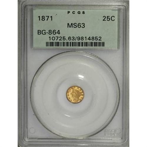 <B>1871 25C Liberty Round 25 Cents, BG-864, R.5, MS63 PCGS.</B></I> Rich butter-yellow surfaces show splashes of hazy green-gold on the reverse. A well struck Select piece that shows a few isolated abrasions, but no trace of wear. Population: 12 in 63, 12 finer (1/08).<BR><BR><b>Shipping:</b> Coins & Currency (<a target="_blank" href="http://www.heritageauctions.com/common/shipping.php">view shipping information</a>)