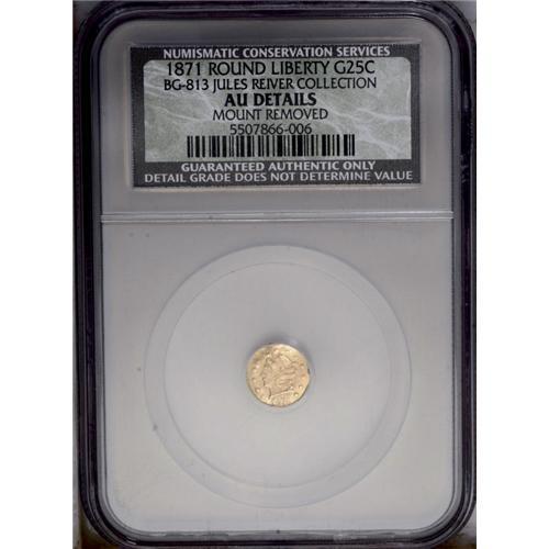 <B>1871<25C> Liberty Round 25 Cents--Mount Removed--NCS. AU Details. BG-813, R.3.</B></I> Yellow-gold surfaces reveal evidence of mount removal at 11 o'clock. The coin also appears wavy, or slightly bent.
