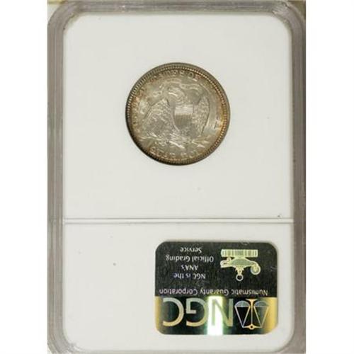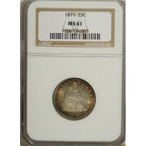 <B>1871 25C MS61 NGC.</B></I> Mint State examples of this date, surviving from a mintage of just 118,200 coins, are extremely difficult to locate. This piece has frosty silver luster with peripheral gold, lilac, and blue toning. A lovely specimen. Census: 3 in 61, 19 finer (1/08).<BR><BR><B>Coin Engraver:</B> Christian Gobrecht<BR><BR><b>Shipping:</b> Coins & Currency (<a target="_blank" href="http://www.heritageauctions.com/common/shipping.php">view shipping information</a>)