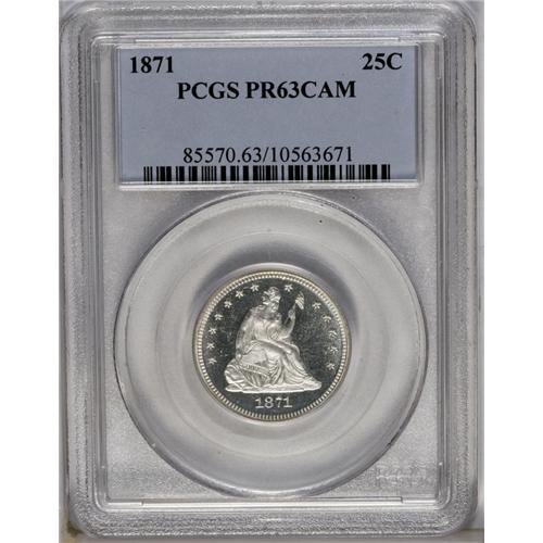 <B>1871<25C> PR63 Cameo PCGS.</B></I> Excellent contrast is demonstrated between the frosty Seated Liberty and the mirrored obverse field. Brilliant save for a dash of gold toning on the left reverse. A well struck representative of this low mintage proof issue. Population: 5 in 63 Cameo, 7 finer (6/06).