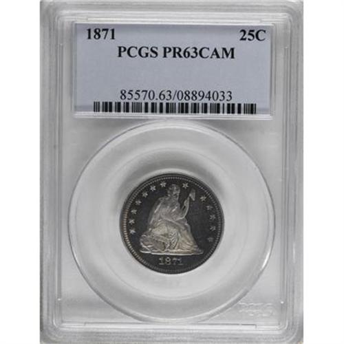 <B>1871 25C PR63 Cameo PCGS.</B></I> Slivers of cobalt-blue, lavender, and golden-brown toning cling to the right margins of both obverse and reverse. Exquisitely struck, frosty design elements stand out amidst the mirrored fields. A faint and inoffensive staple scratch in the upper right obverse field precludes a higher grade. Population: 6 in 63, 6 finer (8/07).<BR><I>From The Beau Clerc Collection.</B></I><BR><BR><b>Shipping:</b> Coins & Currency (<a target="_blank" href="http://www.heritageauctions.com/common/shipping.php">view shipping information</a>)