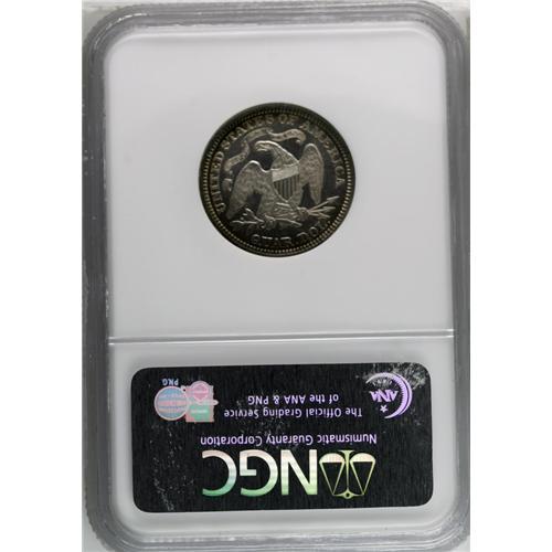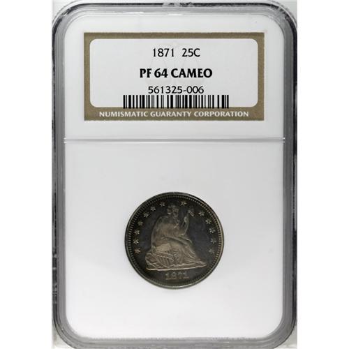 <B>1871<25C> PR64 Cameo NGC.</B></I> Mellow golden patina has settled over both sides, ringed by violet and red. The cameo contrast is pleasing and sharp. Light hairlines in the right obverse field preclude Gem status, but the coin still has great eye appeal.