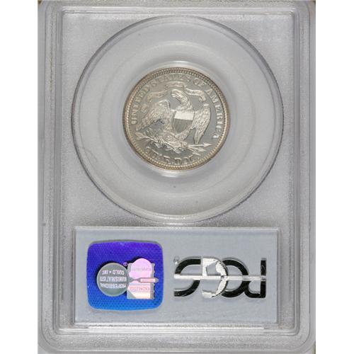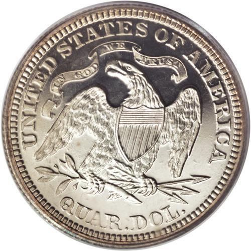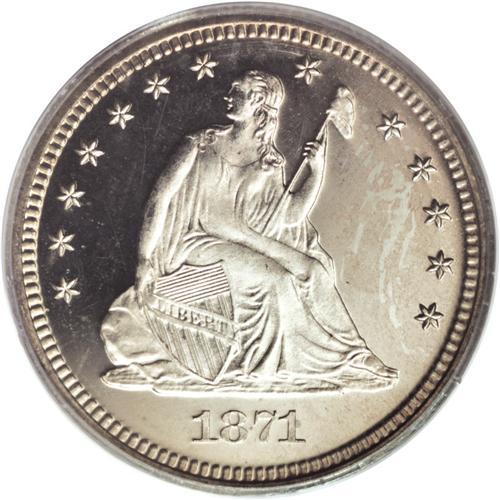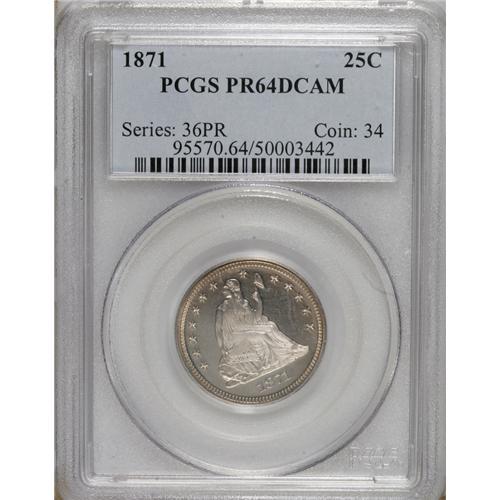 <B>1871 25C PR64 Deep Cameo PCGS.</B></I> Briggs 1-A. Writing in 1991, Larry Briggs (<I>The Comprehensive Encyclopedia of United States Liberty Seated Quarters</B></I>) states of this reverse die: "The folds of the scroll (carrying the motto 'IN GOD WE TRUST') are heavily polished and are very faint or missing." Close inspection of the present near-Gem offers a clue as to why Mint personnel polished this die so extensively. A loupe reveals numerous small pimples throughout the reverse field that point to what appears to be extreme die rust. The coinage staff in Philadelphia undoubtedly polished the dies in an effort to remove this rust.<BR> This is the single finest PCGS-certified proof 1871 Seated quarter with a Deep Cameo designation (3/07). Both sides present as untoned at most angles, but delicate champagne-lilac shadings are seen toward the denticles. Rich mint frost overlays the devices, all of which are fully brought up from an obviously powerful impression. The fields are deeply mirrored, and both sides are expectantly free of hairlines for the PR64 level of preservation.<BR><BR><b>Shipping:</b> Coins & Currency (<a target="_blank" href="http://www.heritageauctions.com/common/shipping.php">view shipping information</a>)