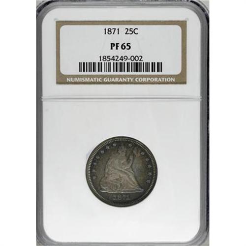 <B>1871 25C PR65 NGC.</B></I> A carefully preserved piece with distinctive, enchanting patina. Gold and peach patina appears over the centers, while the peripheries are blue-green on each side with a segment of magenta on the reverse. One of just 960 specimens coined. Census: 9 in 65, 10 finer (6/07).<BR><BR><B>Coin Engraver:</B> Christian Gobrecht<BR><BR><b>Shipping:</b> Coins & Currency (<a target="_blank" href="http://www.heritageauctions.com/common/shipping.php">view shipping information</a>\)