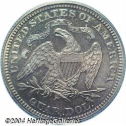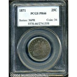 <B>1871<25C> PR66 PCGS.</B></I> Both sides of this proof issue (with a mintage of 960 pieces) are richly toned in steel-blue, violet, lilac, and golden-yellow toning. The design elements are boldly impressed, and no marks of any consequence are apparent on the lovingly preserved surfaces.<BR><I>Ex: Exclusive Internet #21071, (Heritage, 7/01), which realized $2,600.</B></I><BR><I>From the JFS Collection.</B></I> <BR><BR><B>Important notice:</B> Heritage usually auctions material at the rate of 200-250 lots per hour. On some occasions eBay Live bid software or the Internet may not be able to keep up with the pace of the auction. We recommend placing a realistic absentee bid now as insurance to avoid disappointment. Occasionally the auctioneer may eliminate or reject an eBay Live bid, and the auctioneer may also reopen a lot after the close of the eBay live bidding (usually because we missed an audience bid), and may reject your bid even if it shows you as the winning bidder. By bidding via eBay Live, you agree that Heritage may award the lot to another bidder at its sole discretion under the circumstances described above or any other reasonable circumstances. Since eBay bids are not shown to us until we open the lot on the floor, we treat those bids just like floor bids. In most cases the floor responds before the eBay bid is presented to us, due to Internet lag time, so for consistency we have made it a policy that floor bids are always considered first over tie eBay live bids. Also please note that all Heritage lots purchased through eBay Live carry a 20% Buyer's Premium. Please make sure you read the Terms and Conditions before you bid. </span></font></tr></table></td></tr></table>