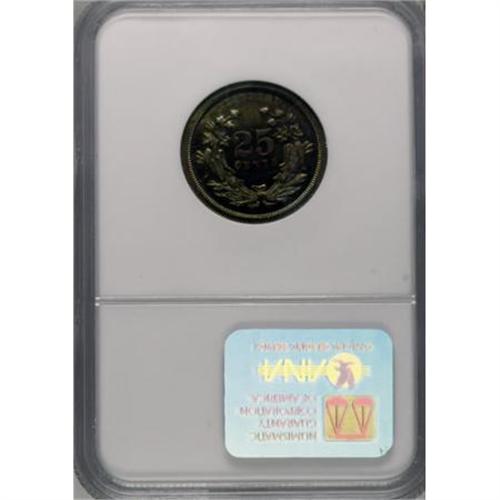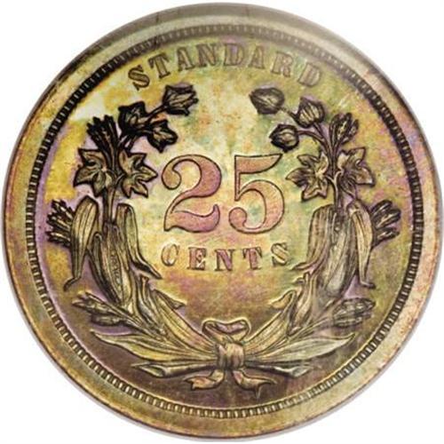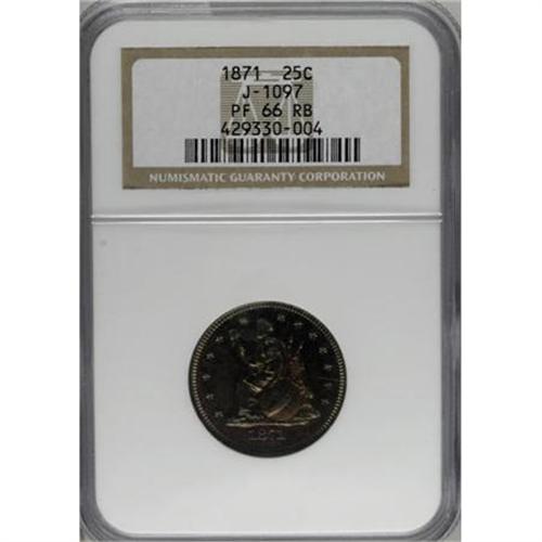 <B>1871 25C Standard Silver Quarter Dollar, Judd-1097, Pollock-1233, R.7, PR66 Red and Brown NGC.</B></I> Liberty is seated facing left on the obverse with the date 1871 below and 13 stars arranged around the border. The reverse depicts the denomination 25 CENTS within a wreath of cotton and corn. The word STANDARD is at the top rim. Struck in copper with a reeded edge. About a dozen pieces are believed known in copper, but only three aluminum examples are confirmed. This is a deeply mirrored proof whose reflectivity is unaffected by the multicolored, autumn leaves toning seen over each side.<BR><BR><b>Shipping:</b> Coins & Currency (<a target="_blank" href="http://www.heritageauctions.com/common/shipping.php">view shipping information</a>)