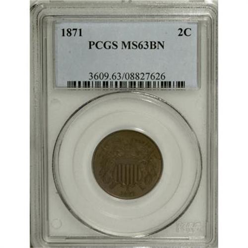 <B>1871 2C MS63 Brown PCGS.</B></I> PCGS Population (43/35). NGC Census: (40/91). Mintage: 721,100. Numismedia Wsl. Price for NGC/PCGS coin in MS63: $292. (#3609)<BR><BR><B>Coin Engraver:</B> James B. Longacre<BR><BR><b>Shipping:</b> Coins & Currency (<a target="_blank" href="http://www.heritageauctions.com/common/shipping.php">view shipping information</a>\)