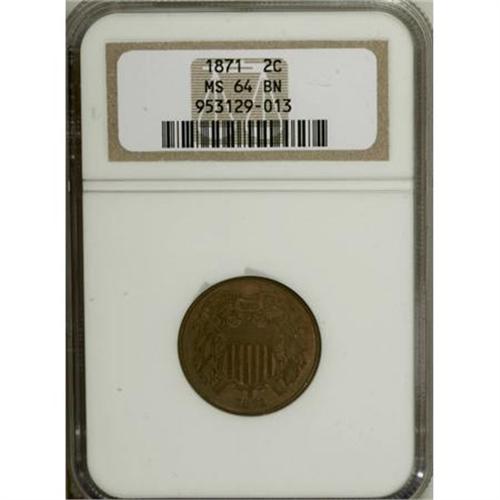 <B>1871 2C MS64 Brown NGC.</B></I> NGC Census: (63/28). PCGS Population (32/3). Mintage: 721,100. Numismedia Wsl. Price for NGC/PCGS coin in MS64: $480. (#3609)<BR><BR><B>Coin Engraver:</B> James B. Longacre<BR><BR><b>Shipping:</b> Coins & Currency (<a target="_blank" href="http://www.heritageauctions.com/common/shipping.php">view shipping information</a>\)