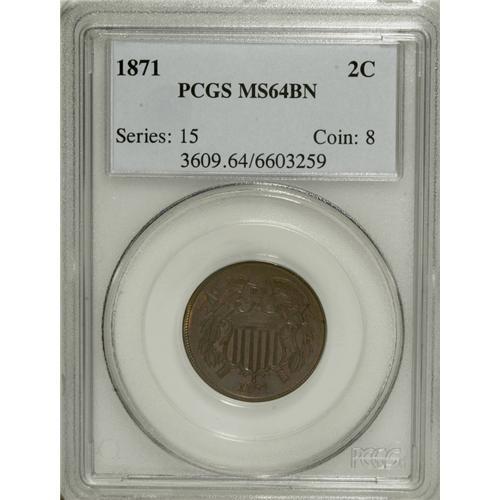 <B>1871 2C MS64 Brown PCGS.</B></I> The rich chocolate-brown coloration is imbued with red-orange highlights indicative of original mint luster. The design elements are sharply struck, and there are no distracting marks or abrasions on either side of this appealing near-Gem. Population: 32 in 64, 3 finer (2/07).<BR><BR><b>Shipping:</b> Coins & Currency (<a target="_blank" href="http://www.heritageauctions.com/common/shipping.php">view shipping information</a>)