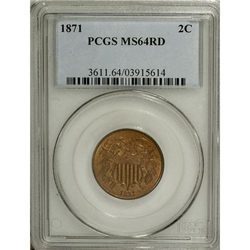 1871 2C MS64 Red PCGS. A scarce, late-date two cent pi