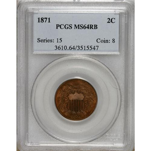 <B>1871 2C MS64 Red and Brown PCGS.</B></I> PCGS Population (80/23). NGC Census: (50/59). Mintage: 721,250. Numismedia Wsl. Price for NGC/PCGS coin in MS64: $585. (#3610)<BR><BR><b>Shipping:</b> Coins & Currency (<a target="_blank" href="http://www.heritageauctions.com/common/shipping.php">view shipping information</a>)