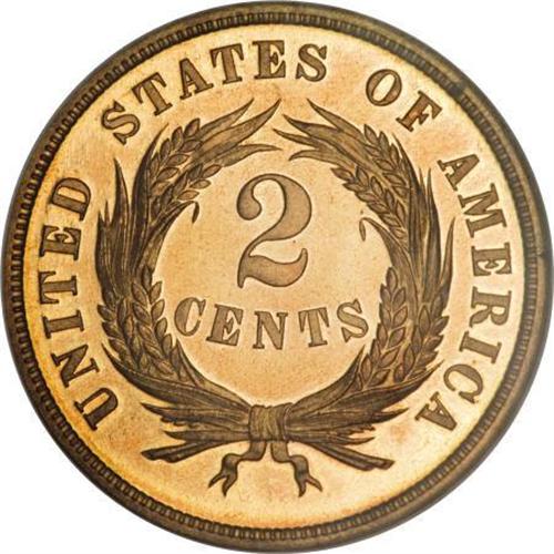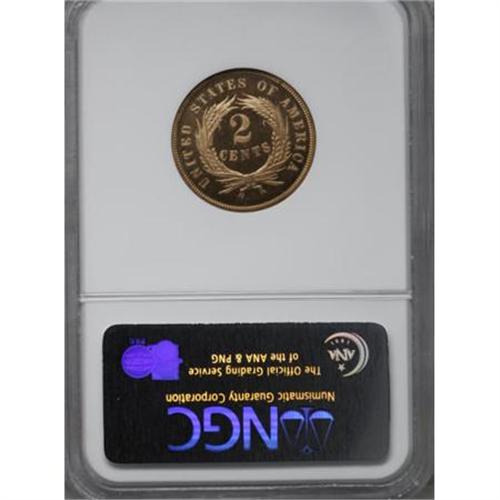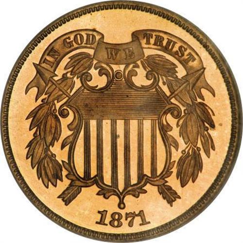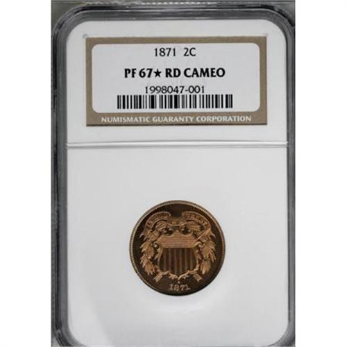 <B>1871 2C PR67 <img src="/images/star.gif" width="10" height="10" alt="" border="0"> Red Cameo NGC.</B></I> The motto is doubled on this piece, as on many proofs of this date, but apparently not all. In his <I>Complete Encyclopedia</B></I>, Breen describes a doubled motto variety, and illustrates that variety with a closeup of TRUST, appearing identical to this piece, although he doesn't mention proof examples in his reference.<BR> A stunning Superb Gem proof with impressive contrast between the fields and devices. Both sides have deep and nearly flawless mirrored fields, surrounding fully detailed and highly lustrous devices.<BR> This piece is the finest proof two cent piece that NGC has ever graded, regardless of date! Just three coins have been called PR67 <B><img src="/images/star.gif" width="10" height="10" alt="" border="0"></B></I>, including an 1870 PR67 <B><img src="/images/star.gif" width="10" height="10" alt="" border="0"></B></I> Brown, an 1872 PR67 <B><img src="/images/star.gif" width="10" height="10" alt="" border="0"></B></I> Red Brown, and this piece. No examples have been graded PR68 or finer.<BR><I>From The New York Eye Appeal Collection, Part Three.</B></I><BR><BR><b>Shipping:</b> Coins & Currency (<a target="_blank" href="http://www.heritageauctions.com/common/shipping.php">view shipping information</a>)