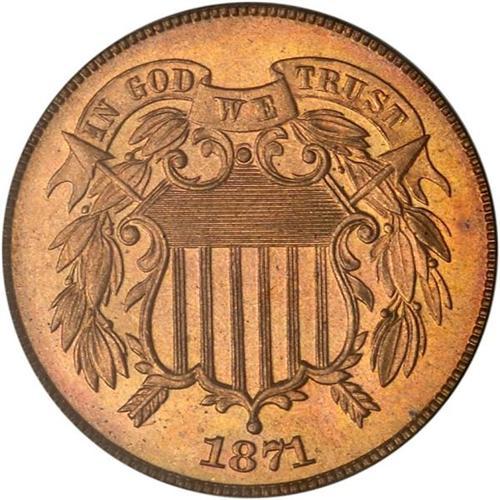 <b>1871 Two Cents. PCGS graded PF65 R.</b> Proof mintage was only 960 pieces. A blazing red gem of the finest order for one of these attractive two-cent Proofs. Intense mirror freshness fairly leaps across to you from the surfaces of this prize. One look at the present full-red gem will satisfy your curiosity as to why few examples of the date has been certified finer than the present Proof 65 Red. The mathematically exact standards seen in the sharp centers, make this date noteworthy since so-so detail in the key high points, such as shield and leaf veins is more often the case <b>(PCGS # 3647)</b>