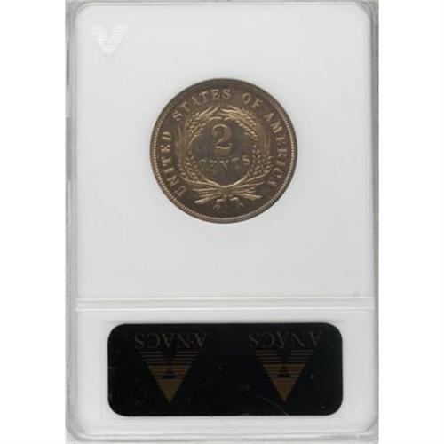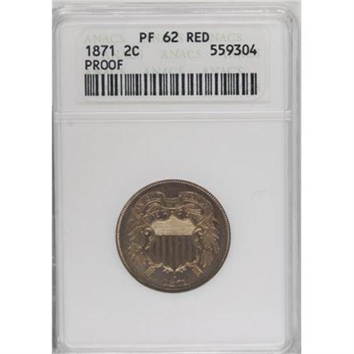 <B>1871 2C PR62 Red ANACS.</B></I> A beautiful sun-gold two cent piece. The strike is penetrating, and carbon and marks are minimal. The obverse rim at 7:30 has a small lamination, and a lintmark wanders above the N in CENT. TRUST is die doubled, as always.<BR><BR><B>Coin Engraver:</B> James B. Longacre<BR><BR><b>Shipping:</b> Coins & Currency (<a target="_blank" href="http://www.heritageauctions.com/common/shipping.php">view shipping information</a>)