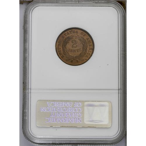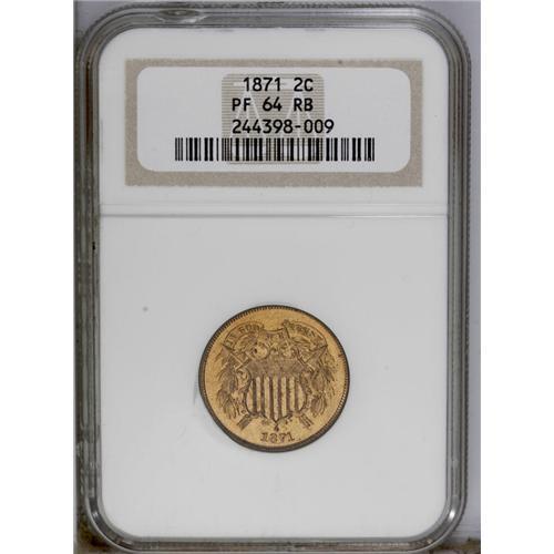<B>1871<2C> PR64 Red and Brown NGC.</B></I> Coppery-gold surfaces display more flash on the obverse. The design features are sharply struck, and a few flecks are scattered over each side. <BR><BR><B>Important notice:</B> Heritage usually auctions material at the rate of 200-250 lots per hour. On some occasions eBay Live bid software or the Internet may not be able to keep up with the pace of the auction. We recommend placing a realistic absentee bid now as insurance to avoid disappointment. Occasionally the auctioneer may eliminate or reject an eBay Live bid, and the auctioneer may also reopen a lot after the close of the eBay live bidding (usually because we missed an audience bid), and may reject your bid even if it shows you as the winning bidder. By bidding via eBay Live, you agree that Heritage may award the lot to another bidder at its sole discretion under the circumstances described above or any other reasonable circumstances. Since eBay bids are not shown to us until we open the lot on the floor, we treat those bids just like floor bids. In most cases the floor responds before the eBay bid is presented to us, due to Internet lag time, so for consistency we have made it a policy that floor bids are always considered first over tie eBay live bids. Also please note that all Heritage lots purchased through eBay Live carry a 20% Buyer's Premium. Please make sure you read the Terms and Conditions before you bid. This lot is being auctioned in conjunction with a live floor auction by Heritage Galleries & Auctioneers. All final auction and invoice information will be supplied by Heritage Galleries & Auctioneers, and all other information should be considered preliminary. Lot:748 <BR><BR><B>Winning Notification and Billing:</B> After the FINAL session in this auction is complete, Heritage will send e-mail and snail mail invoices. This process normally takes several days. All final auction and invoice information will be supplied by Heritage Galleries & Auctioneers, and all other information should be considered preliminary. <BR><BR>This auction will be conducted on a live auction floor and over the Internet through eBay Live. If you choose to place an absentee bid, please take a moment to <font color='#0000ff'><u><a href='http://pages.ebay.com/liveauctions/help/before/laabsentee.html'>learn how eBay Live absentee bidding works</a></u></font><font color='#000000'>