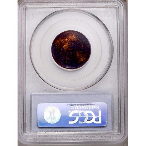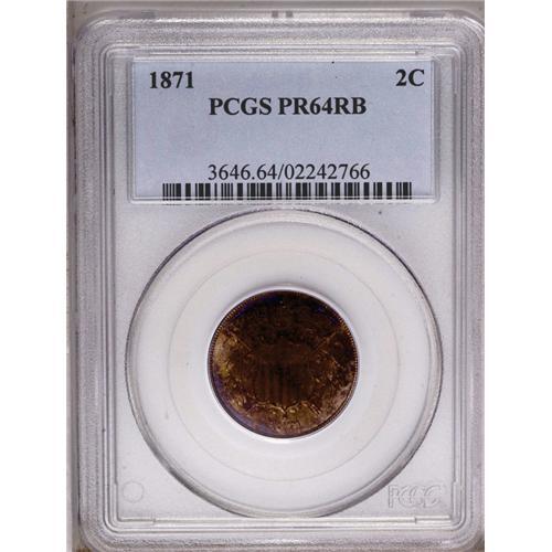 <B>1871<2C> PR64 Red and Brown PCGS.</B></I> Orange-red luster competes for territory with deep cobalt-blue and plum toning. An intricately struck and unmarked near-Gem. TRUST is strongly die doubled, as always seen on proofs of this date.