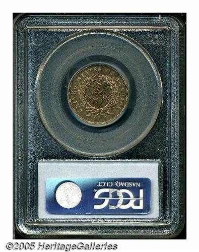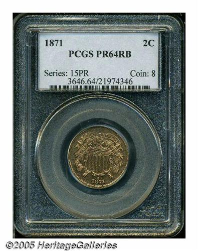 <B>1871<2C> PR64 Red and Brown PCGS.</B></I> Virtually full red is diminished only slightly by splashes of lilac toning on both sides. Sharply struck with moderately reflective fields.