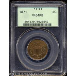 <table><tr><td><TABLE cellSpacing=0 cellPadding=0 width="100%" bgColor=#000000 border=0><TBODY> <TR><TD width="100%"><TABLE cellSpacing=1 cellPadding=3 width="100%" border=0><TBODY><TR><TD width="100%" bgColor=#79735c><FONT face=arial color=#ffffff size=3><B>Description</B> </FONT></TD></TR><TR><TD width="100%" bgColor=#ffffff><FONT face=arial size=2><B>1871 2C PR64 Red and Brown PCGS.</B></I> A well struck near-Gem that has lovely variegated honey-gold, ruby-red, and aqua patina. Splendidly preserved, and encapsulated in an older green label holder. TRUST is strongly die doubled, as expected for this later proof issue. </FONT></TD></TR></TBODY></TABLE></TD></TR></TBODY></TABLE><BR><A name=PricesRealized></A><TABLE cellSpacing=0 cellPadding=0 width="100%" bgColor=#000000 border=0><TBODY><TR><TD width="100%"><TABLE cellSpacing=1 cellPadding=3 width="100%" border=0><TBODY><TR><TD width="100%" bgColor=#79735c><A name=PR><FONT face=arial color=#ffffff size=3><B>Previous Prices from Heritage Auctions</B> </FONT></A></TD></TR><TR><TD bgColor=#f6f6ed><TABLE cellSpacing=0 cellPadding=0 width="100%" border=1><TBODY><TR><TD align=middle width="33%"><B>Date</B></TD><TD align=middle width="33%"><B>Service</B></TD><TD align=middle width="33%"><B>Price</B></TD></TR><TR bgColor=whitesmoke><TD width="33%"><B>10/20/1999</B></TD><TD width="33%">PCGS</TD><TD width="33%">$370.00</TD></TR><TR bgColor=whitesmoke><TD width="33%"><B>07/29/2003</B></TD><TD width="33%">PCGS</TD><TD width="33%">$690.00</TD></TR><TR bgColor=whitesmoke><TD width="33%"><B>01/11/2003</B></TD><TD width="33%">PCGS</TD><TD width="33%">$483.00</TD></TR><TR bgColor=whitesmoke><TD width="33%"><B>02/24/2002</B></TD><TD width="33%">PCGS</TD><TD width="33%">$410.55</TD></TR><TR bgColor=whitesmoke><TD width="33%"><B>04/05/2001</B></TD><TD width="33%">PCGS</TD><TD width="33%">$632.50</TD></TR><TR bgColor=whitesmoke><TD width="33%"><B>08/07/1999</B></TD><TD width="33%">PCGS</TD><TD width="33%">$437.00</TD></TR><TR bgColor=whitesmoke><TD width="33%"><B>04/24/1998</B></TD><TD width="33%">PCGS</TD><TD width="33%">$374.00</TD></TR><TR bgColor=whitesmoke><TD width="33%"><B>06/07/1997</B></TD><TD width="33%">NGC</TD><TD width="33%">$396.00</TD></TR><TR bgColor=whitesmoke><TD width="33%"><B>01/11/1997</B></TD><TD width="33%">NGC</TD><TD width="33%">$373.75</TD></TR><TR bgColor=whitesmoke><TD width="33%"><B>03/01/1997</B></TD><TD width="33%">NGC</TD><TD width="33%">$660.00</TD></TR></TBODY></TABLE></TD></TR><TR><TD bgColor=#ffffff><FONT face=arial size=1 ?>PLEASE NOTE: All prices realized reflect the final hammer price PLUS the buyer's premium in auctions that charge a buyer's premium. Each item has a notation at the top of the listing indicating whether that lot included a buyer's premium. Example: A item that sells with a final hammer price of $100 and a 20% buyer's premium will display with a price realized of $120. All information listed is intended to be as accurate as possible, but errors are possible. Please use this guide carefully and inform us of any inaccuracies. </FONT></TD></TR></TBODY></TABLE></TD></TR></TBODY></TABLE><BR><TABLE cellSpacing=0 cellPadding=0 width="100%" bgColor=#000000 border=0><TBODY><TR><TD width="100%"><TABLE cellSpacing=1 cellPadding=3 width="100%" border=0><TBODY><TR><TD width="100%" bgColor=#79735c colSpan=6><FONT face=arial color=#ffffff size=3><B>Price Guide*</B> </FONT></TD></TR><TR bgColor=#f6f6ed><TD align=middle><B>Grade</B> </TD><TD align=middle><B>Coin World<BR>(Trends)</B> </TD><TD align=middle><B>Numismedia<BR>Retail</B> </TD><TD align=middle><B>Numismedia<BR>Wholesale</B> </TD><TD align=middle><B>Coin<BR>Universe</B> </TD><TD align=middle><B>Heritage<BR>Value Index</B> </TD></TR><TR bgColor=#ffffff><TD align=middle>63</TD><TD align=right>---</TD><TD align=right>$440.00</TD><TD align=right>$367.00</TD><TD align=right>$465.00</TD><TD align=right>$311.25</TD></TR><TR style="FONT-WEIGHT: bold" bgColor=#cccfdd><TD align=middle>64</TD><TD align=right>---</TD><TD align=right>$660.00</TD><TD align=right>$525.00</TD><TD align=right>$550.00</TD><TD align=right>$481.33</TD></TR><TR bgColor=#ffffff><TD align=middle>65</TD><TD align=right>---</TD><TD align=right>$880.00</TD><TD align=right>$700.00</TD><TD align=right>$790.00</TD><TD align=right>$580.17</TD></TR><TR bgColor=#ffffff><TD colSpan=6><FONT size=1>*All information listed is intended to be as accurate as possible, but errors are possible. No item may be returned or refused based on this information which is provided as a service to our customers. You should contact each pricing source directly to determine the accuracy of this information. </FONT></TD></TR></TBODY></TABLE></TD></TR></TBODY></TABLE><BR><TABLE cellSpacing=0 cellPadding=0 width="100%" bgColor=#000000 border=0><TBODY><TR><TD width="100%"><TABLE cellSpacing=1 cellPadding=3 width="100%" border=0><TBODY><TR><TD width="100%" bgColor=#79735c><FONT face=arial color=#ffffff size=3><B>Population Guide</B> </FONT></TD></TR><TR bgColor=#ffffff><TD align=middle><!-- Begin Output of Population Grid--><TABLE cellSpacing=0 cellPadding=0 width="100%" border=0><TBODY><TR><TD vAlign=center><TABLE cellSpacing=0 width="100%" border=1 cellsadding="3"><TBODY><TR><TD vAlign=center><TABLE cellSpacing=0 cellPadding=3 width="100%" border=1><TBODY><TR><TD vAlign=center align=middle bgColor=#f0f1e8 colSpan=2 <CENTER><FONT face=Arial size=2><B>PCGS Pop </B></FONT><CENTER></CENTER></TD><TD vAlign=center align=middle bgColor=#f0f1e8 colSpan=2><CENTER><FONT face=Arial size=2><B>NGC Pop</B></CENTER></FONT></TD></TR><TR><TD vAlign=center><FONT face=Arial size=2>(64)</FONT> </TD><TD vAlign=center align=right><FONT face=Arial size=2>81</FONT> </TD><TD vAlign=center><FONT face=Arial size=2>(64)</FONT> </TD><TD vAlign=center align=right><FONT face=Arial size=2>32</FONT> </TD></TR><TR><TD vAlign=center><FONT face=Arial size=2>(>64)</FONT> </TD><TD vAlign=center align=right><FONT face=Arial size=2>66</FONT> </TD><TD vAlign=center><FONT f