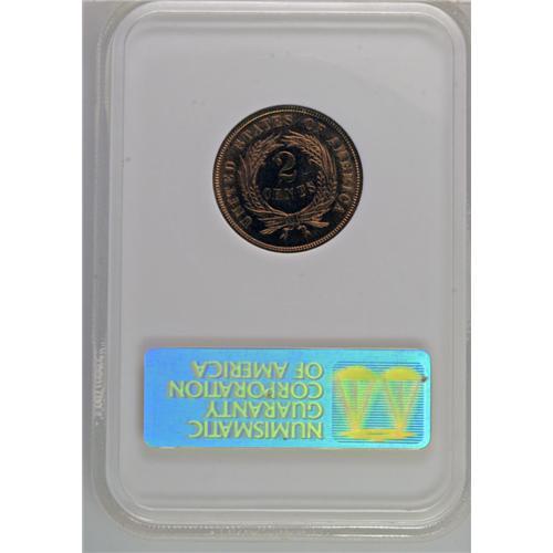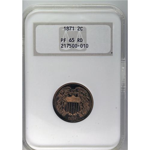 <B>1871<2C> PR65 Red NGC.</B></I> A crisply struck and original Gem with excellent reflectivity for this series. The reddish-orange surfaces are mostly consistent, though the red is somewhat deeper within the wreath. Census: 33 in 65 Red, 6 finer (8/06).