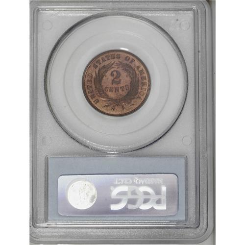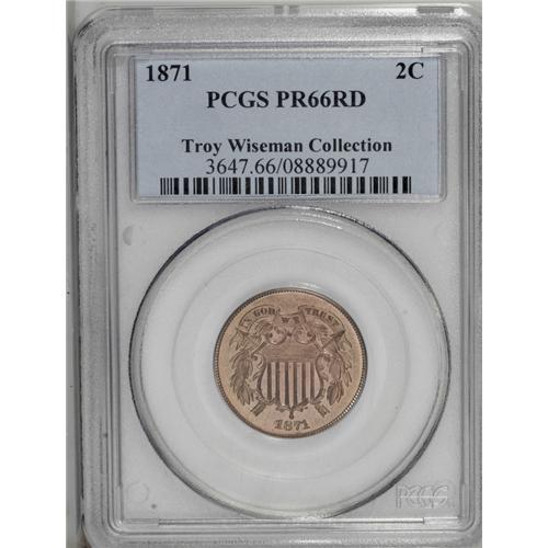 <B>1871<2C> PR66 Red PCGS.</B></I> Dies for this issue forward were produced from a new hub. The left berry closest to the scroll end is elongated--not rounded as before--and there is a straight underside to the left arrow butt. This specimen is a scintillating tan-gold Gem with glints of carmine in the center obverse, deepening on the reverse to burnt orange. This piece is blessed with a bold strike that provides full venation to the leaves on each side (although the hub makes the left-side reverse leaves less pronounced). Population: 10 in 66, 1 finer (8/06).<BR><I>From The Troy Wiseman Collection.</B></I>