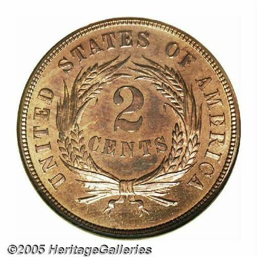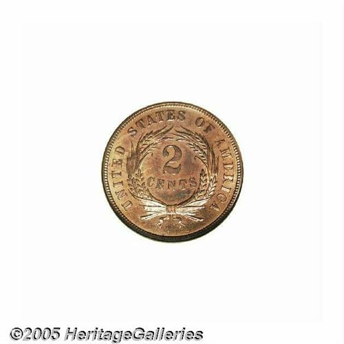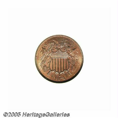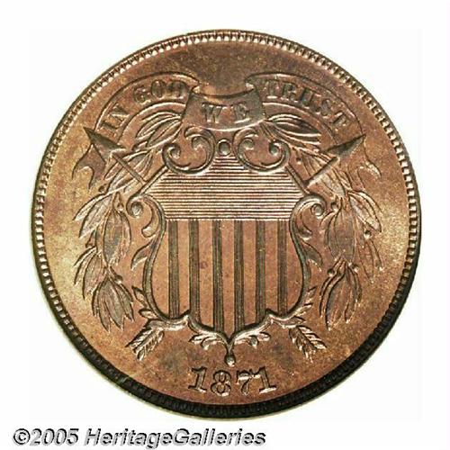 <B>1871<2C> PR67 Red and Brown NGC.</B></I> An exquisitely struck Superb Gem whose salmon-pink color has slightly mellowed in lilac hues. Flashy and gorgeously preserved. TRUST is widely die doubled, a characteristic of the entire proof issue, although not diagnostic since the obverse die was also used to produce business strikes. Population: 1 in 67 Red and Brown, 1 finer as 67 Red (6/05).<BR><I>From The Melrose Bay Collection.</B></I>