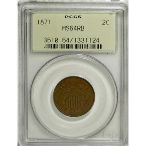 <B>1871 2C MS64 Red and Brown PCGS.</B></I> PCGS Population (83/23). NGC Census: (51/58). Mintage: 721,250. Numismedia Wsl. Price for NGC/PCGS coin in MS64: $685. (#3610)<BR><BR><B>Coin Engraver:</B> James B. Longacre<BR><BR><b>Shipping:</b> Coins & Currency (<a target="_blank" href="http://www.heritageauctions.com/common/shipping.php">view shipping information</a>)
