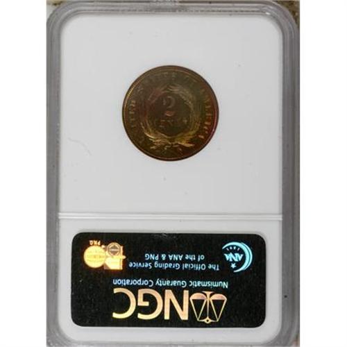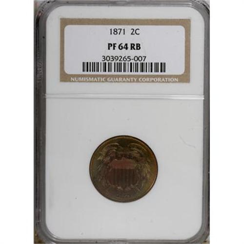 <B>1871 2C PR64 Red and Brown NGC.</B></I> NGC Census: (42/71). PCGS Population (90/75). Mintage: 960. Numismedia Wsl. Price for NGC/PCGS coin in PR64: $550. (#3646)<BR><BR><B>Coin Engraver:</B> James B. Longacre<BR><BR><b>Shipping:</b> Coins & Currency (<a target="_blank" href="http://www.heritageauctions.com/common/shipping.php">view shipping information</a>\)