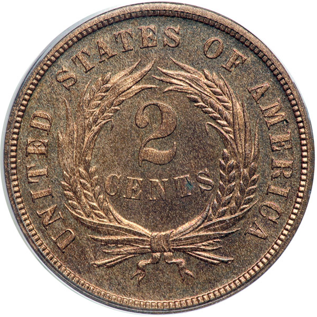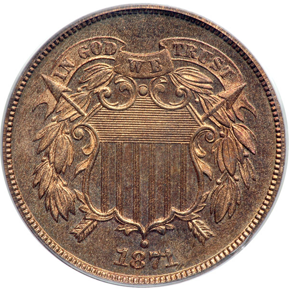 1871 Two Cents. PCGS graded Proof 64 Red & Brown. Lovely toning. Only 960 minted. Pop 103; 88 finer (PCGS # 3646) .