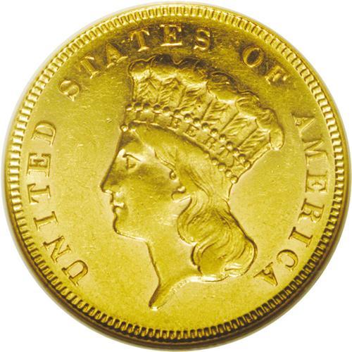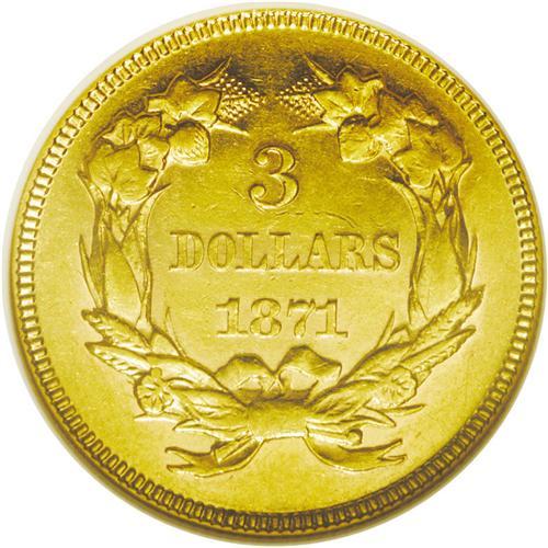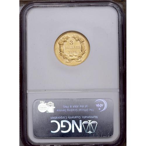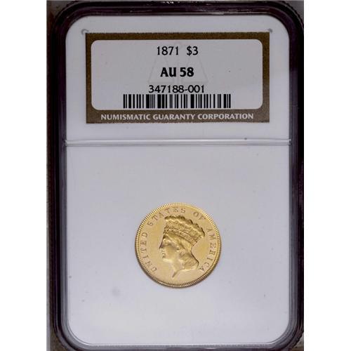 <B>1871<$3> AU58 NGC.</B></I> Although attractive AU representatives of this issue are easily obtainable (at least by the standards of the three dollar gold series), high quality Mint State survivors are elusive. Arguably more desirable than a lackluster or heavily abraded BU example, this AU58 representative is colored in bright yellow-gold shades. Attractive prooflike tendencies are seen in the fields, the devices are sharply impressed, and those abrasions that are present are small in size. One of only 1,300 business strikes produced.