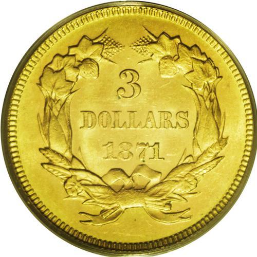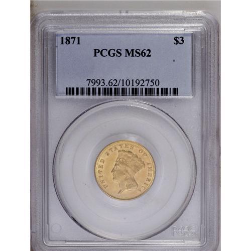 <B>1871<$3> MS62 PCGS.</B></I> Any Uncirculated three dollar piece is eagerly pursued, but the 1871 should not be confused with a common date, such as the 1878. The mintage for the 1871 is just 1,300 pieces, plus an additional 30 proofs. The present luminous apricot-gold example shows minor striking bluntness on the wreath bow and the 8 in the date, but most of the design is bold. Clean for the grade aside from a single tick on the cheek. Population: 20 in 62, 19 finer (6/06).