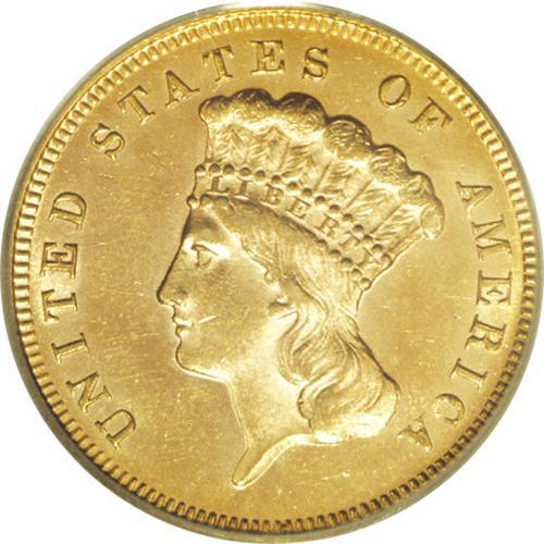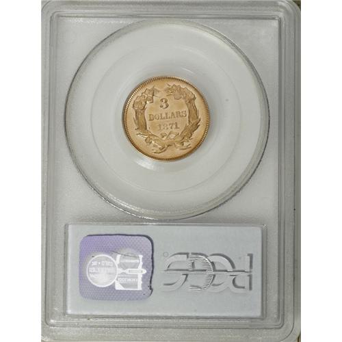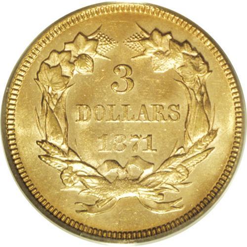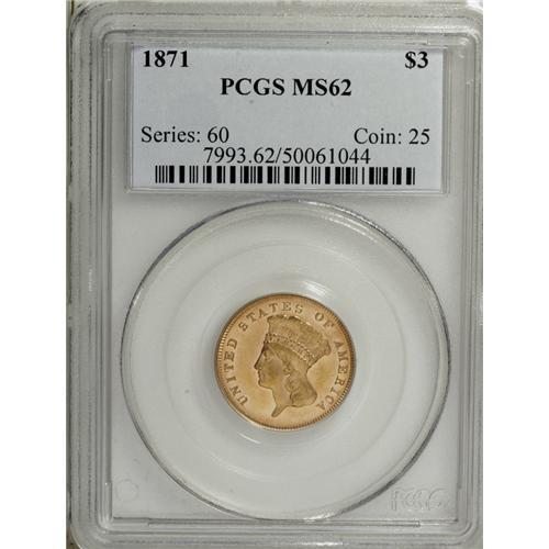 1871 $3 MS62 PCGS. Despite the low mintage of 1,300 bu