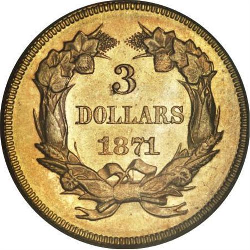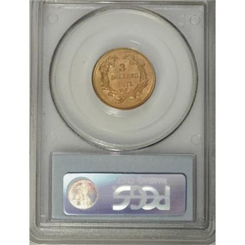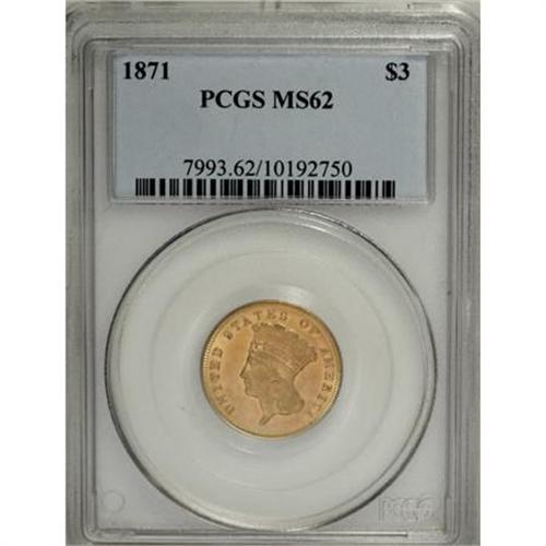 <B>1871 $3 MS62 PCGS.</B></I> Any Uncirculated three dollar gold piece is eagerly pursued, but the 1871 should not be confused with common dates such as the 1874 or 1878. The mintage for the 1871 is just 1,300 pieces, plus an additional 30 proofs. The present luminous apricot-gold example shows minor striking bluntness on the wreath bow and the 8 in the date, but most of the design is bold. Clean for the grade aside from a single tick on the cheek. Population: 22 in 62, 21 finer (3/08).<BR><BR><B>Coin Engraver:</B> James B. Longacre<BR><BR><b>Shipping:</b> Coins & Currency (<a target="_blank" href="http://www.heritageauctions.com/common/shipping.php">view shipping information</a>)