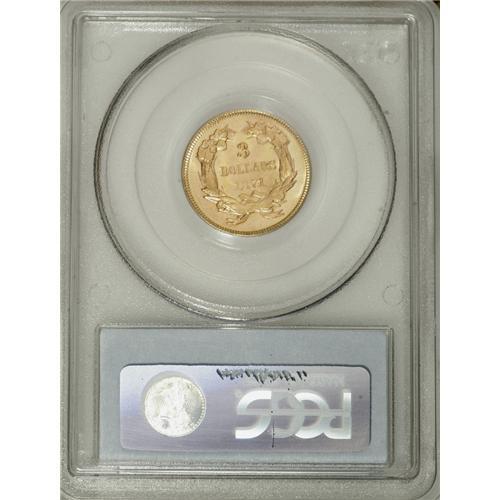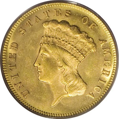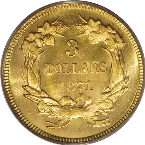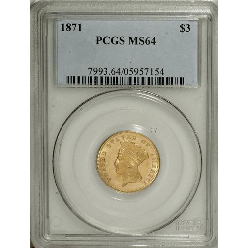 <B>1871 $3 MS64 PCGS.</B></I> Only 1,300 three dollar pieces were coined in 1871, placing this among the rarest low-mintage business strike issues in the series. Fortunately for us today, a few far-sighted collectors of the 1870s put Mint State examples aside for their collections, thus examples are attainable today, given enough time. PCGS has certified 54 Mint State examples of this date, but only one is graded higher than this issue, and it is an amazing Superb Gem MS67 coin. This piece has prooflike fields much like nearly every known example of the date, although it is clearly a business strike piece, and not a proof. both sides are fully lustrous with brilliant orange-gold color.<BR><BR><b>Shipping:</b> Coins & Currency (<a target="_blank" href="http://www.heritageauctions.com/common/shipping.php">view shipping information</a>)