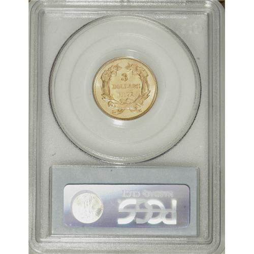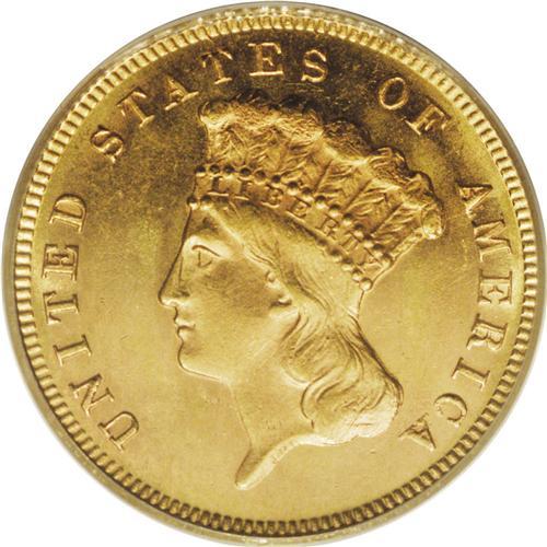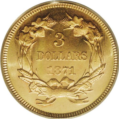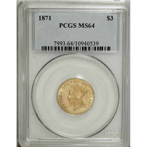 <B>1871 $3 MS64 PCGS.</B></I> The never-popular three dollar denomination suffered a drawn-out demise, with the last 29 years of coinage at the Philadelphia Mint only and just two issues with more than 10,000 pieces coined. At 1,300 business strikes produced, the 1871 is one of the many issues that embody the concept of a nominal mintage. This Choice wheat-gold example is one of the best-preserved survivors. The luster is strong and partially prooflike, unsurprising given the low mintage, and the strike is adequate. The overall appearance is clean, and only some small, scattered marks keep this example from a Gem grade. NGC has graded no pieces finer, and the only example awarded a higher grade by PCGS is a solitary Superb Gem (11/06).<BR><BR><b>Shipping:</b> Coin/Currency (<a target="_blank" href="http://www.heritageauctions.com/common/shipping.php">view shipping information</a>)