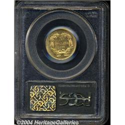 <B>1871<$3> MS64 PCGS.</B></I> A rare Three Dollar issue with the vast majority of known survivors are XF and AU with Mint State examples very rare. Unlike many 1871s, this piece is not wholly prooflike, but does display a moderate semi-reflectivity in the fields that enlivens the subtle champagne-golden patination that covers each side. Fairly well struck, as usually found, with only slight abrasions to account for the grade, there is only the slightest reported weakness on the hair curls and the bow knot. Bright and highly desirable. Population: 10 in 64, 2 finer (3/04).<BR><I>From The Greenwich Collection, Part One.</B></I> <BR><BR><B>Important notice:</B> Heritage usually auctions material at the rate of 200-250 lots per hour. On some occasions eBay Live bid software or the Internet may not be able to keep up with the pace of the auction. We recommend placing a realistic absentee bid now as insurance to avoid disappointment. Occasionally the auctioneer may eliminate or reject an eBay Live bid, and the auctioneer may also reopen a lot after the close of the eBay live bidding (usually because we missed an audience bid), and may reject your bid even if it shows you as the winning bidder. By bidding via eBay Live, you agree that Heritage may award the lot to another bidder at its sole discretion under the circumstances described above or any other reasonable circumstances. Since eBay bids are not shown to us until we open the lot on the floor, we treat those bids just like floor bids. In most cases the floor responds before the eBay bid is presented to us, due to Internet lag time, so for consistency we have made it a policy that floor bids are always considered first over tie eBay live bids. Also please note that all Heritage lots purchased through eBay Live carry a 20% Buyer's Premium. Please make sure you read the Terms and Conditions before you bid.