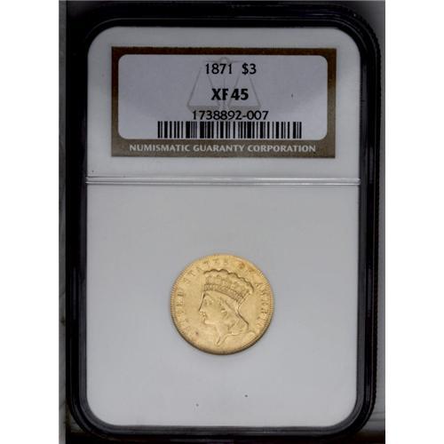 <B>1871<$3> XF45 NGC.</B></I> Moderate highpoint wear and a somewhat muted appearance are features of this circulated example. The khaki-green surfaces display few hairlines and even fewer blemishes. Only 1,300 business strikes were produced of this scarce issue.<BR><I>From The Steve Glenn Collection.</B></I> <BR><BR><B>Important notice:</B> Heritage usually auctions material at the rate of 200-250 lots per hour. On some occasions eBay Live bid software or the Internet may not be able to keep up with the pace of the auction. We recommend placing a realistic absentee bid now as insurance to avoid disappointment. Occasionally the auctioneer may eliminate or reject an eBay Live bid, and the auctioneer may also reopen a lot after the close of the eBay live bidding (usually because we missed an audience bid), and may reject your bid even if it shows you as the winning bidder. By bidding via eBay Live, you agree that Heritage may award the lot to another bidder at its sole discretion under the circumstances described above or any other reasonable circumstances. Since eBay bids are not shown to us until we open the lot on the floor, we treat those bids just like floor bids. In most cases the floor responds before the eBay bid is presented to us, due to Internet lag time, so for consistency we have made it a policy that floor bids are always considered first over tie eBay live bids. Also please note that all Heritage lots purchased through eBay Live carry a 20% Buyer's Premium. Please make sure you read the Terms and Conditions before you bid. This lot is being auctioned in conjunction with a live floor auction by Heritage Galleries & Auctioneers. All final auction and invoice information will be supplied by Heritage Galleries & Auctioneers, and all other information should be considered preliminary. Lot:2584 <BR><BR><B>Winning Notification and Billing:</B> After the FINAL session in this auction is complete, Heritage will send e-mail and snail mail invoices. This process normally takes several days. All final auction and invoice information will be supplied by Heritage Galleries & Auctioneers, and all other information should be considered preliminary. <BR><BR>This auction will be conducted on a live auction floor and over the Internet through eBay Live. If you choose to place an absentee bid, please take a moment to <font color='#0000ff'><u><a href='http://pages.ebay.com/liveauctions/help/before/laabsentee.html'>learn how eBay Live absentee bidding works</a></u></font><font color='#000000'>