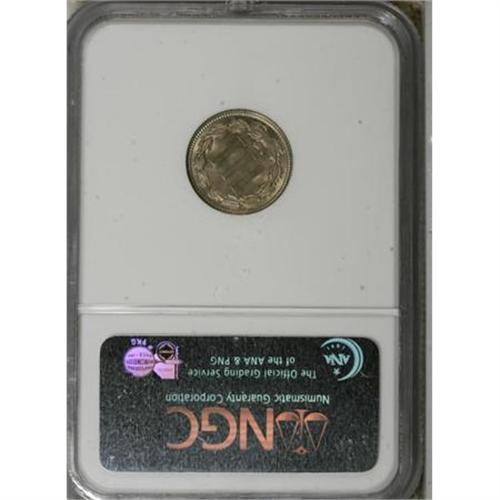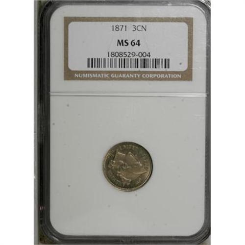 <B>1871 3CN MS64 NGC.</B></I> NGC Census: (74/41). PCGS Population (66/55). Mintage: 603,000. Numismedia Wsl. Price for NGC/PCGS coin in MS64: $220. (#3737)<BR><BR><B>Coin Engraver:</B> James B. Longacre<BR><BR><b>Shipping:</b> Coins & Currency (<a target="_blank" href="http://www.heritageauctions.com/common/shipping.php">view shipping information</a>)